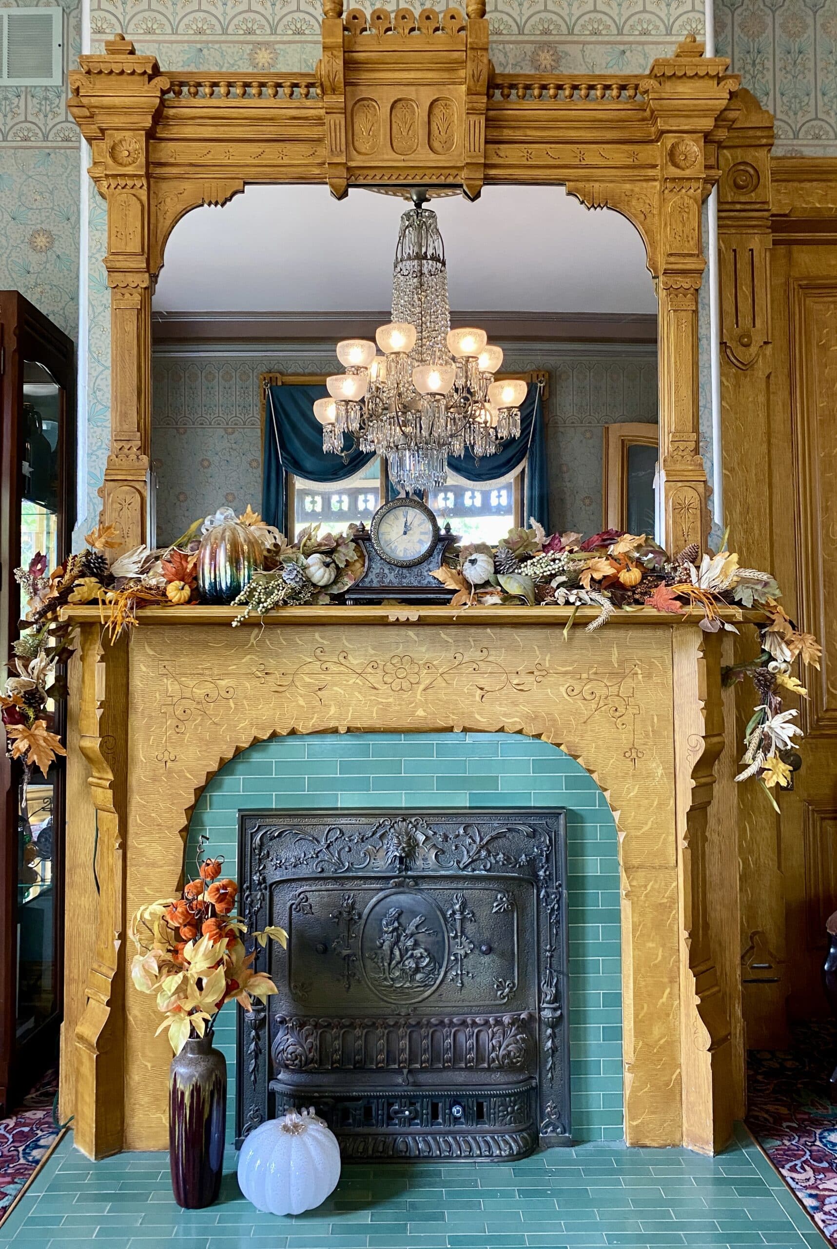 As you relax, take in the exquisite details around you—the timeless Bradbury and Bradbury wallpaper, the beautifully tiled fireplace, and the meticulous faux-graining that enhances the original woodwork. Don’t miss the artistic ceiling medallion, featuring intricate decorative paintwork that highlights the home’s original pewter and crystal chandelier.